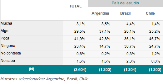 Se podría pensar que la desconfianza y la desaprobación hacia el Congreso Nacional sería parte de un fenómeno compartido con el resto del mundo, sin embargo, los datos de Latinobarómetro en el 2011 señalan que Chile se encuentra por debajo de sus pares latinoamericanos con un (26,6%) –cuanta confianza tiene usted en el Congreso: mucha/algo-, es decir, nos encontramos por debajo de Uruguay (62,6%), Argentina (40,6%), Brasil (30,5%), México (27,9%), Colombia (28,1%). De hecho ya en el 2008 Latinobarómetro observaba como entre los 18 congresos de la región, Chile disminuía ubicándose en el lugar número 14, en cuanto al porcentaje de los encuestados que consideran que el trabajo del parlamento es bueno o muy bueno.