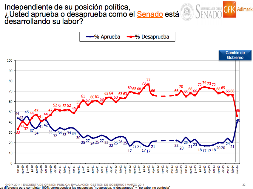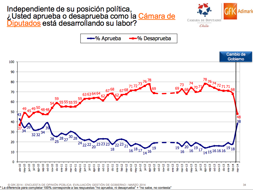 Con porcentajes en torno al 20% de aprobación tanto para la Cámara de Diputados como al Senado y con un rechazo a ambas cámaras en torno al 60% (Adimark), esta evaluación de la ciudadanía es parte de una tendencia que sólo ha tenido un cambio que coincide con el fin del gobierno de la Alianza y un nuevo ciclo parlamentario. La aprobación del Senado subió 19 puntos, para llegar al 40 de aprobación, mientras que la Cámara de Diputados aumentó 20 puntos y se posicionó en 38% de aprobación (Adimark, Marzo 2014).