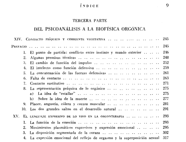 Reich: “Al relajarse los músculos del cuello, escaparon poderosos impulsos, como impelidos por un resorte. La palidez y el rubor que alternaban en el rostro no podían ser otra cosa que el movimiento de un lado para otro de los fluidos corporales, la contracción y el relajamiento alternantes de los vasos sanguíneos. Eso concordaba perfectamente con mi concepto del funcionamiento de la energía biológica. La dirección «fuera del yo-hacia el mundo» alternaba velozmente con la dirección opuesta «fuera del mundo-retorno al yo». (Reich, La función del orgasmo, pág 264).