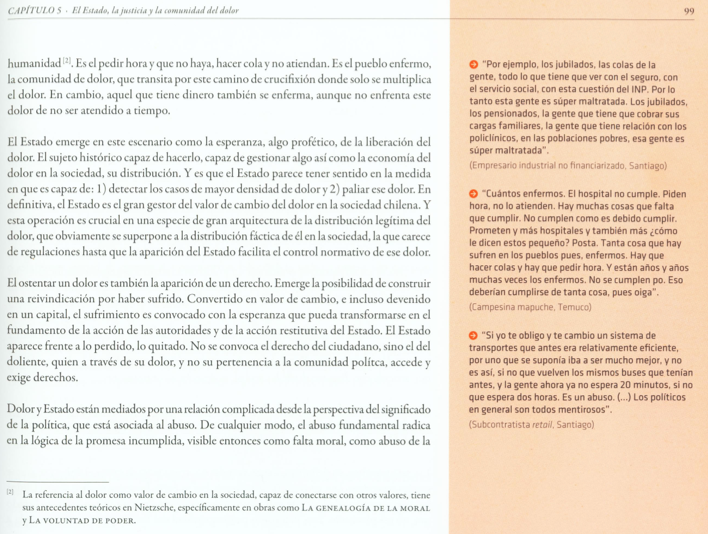 El Estado emerge en este escenario como la esperanza, como algo profético, de la liberación del dolor. El sujeto histórico capaz de hacerlo, capaz de gestionar algo así como la economía del dolor en la sociedad, su distribución (El Chile Profundo, pág 99). El ostentar un dolor, sería también la aparición de un derecho.
