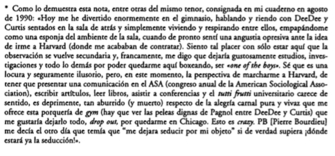 «Especie de Bildungsroman (novela de educación) sociopugilistica que repasa una experiencia personal de iniciacion a un trabajo fisico tan reconocido por su simbolismo heroico …(…)… como desconocido en su realidad prosaica, este libro es ademas un experimento cientifico. Pretende ser una demostracion empirica de la fecundidad de un enfoque que toma en serio, tanto en el plano teorico como en el metodologico y retorico, el hecho de que el agente social es, ante todo, un ser de carne, nervio y sentidos (en el doble sentido de sensual y significado), un «ser que sufre» {leidenschajilisch Wesen decia el joven Marx en sus Manuscritos de 1844) y que participa del universo que lo crea y que, por su parte, contribuye a construir con todas las fibras de su cuerpo y su corazon». (Prólogo a la edición en español). Y es cierto que incluso pensó en abandonar la academia y dedicarse al boxeo (Ver pág 22).