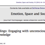 Liz Bondi de la Universidad de Edimburgo, Escocia, señala que el campo de las geografías emocionales plantea cuestiones metodológicas difíciles sobre cómo los investigadores producen conocimiento acerca de los sentimientos de los demás. Understanding feelings: Engaging with unconscious communication and embodied knowledge. 11 págs. DESCARGAR: Bondi, Liz (2014). Understanding feelings. El articulo muestra cómo las ideas psicoanalíticas acerca de la comunicación inconsciente se pueden utilizar para ayudar a dar sentido a las dimensiones emocionales de las entrevistas de investigación y las narrativas que generan. Se presenta la idea de la «receptividad inconsciente», que conecta con la construcción de la confianza y el concepto de relación. Bondi muestra cómo el embodied (cuerpo encarnado), así como la respuesta afectiva durante y después de la entrevista da pistas para la comprensión de las dimensiones emocionales de la narrativa del entrevistado. Este análisis contribuye a los debates metodológicos sobre la investigación de las geografías emocionales y en la discusión de los usos metodológicos del psicoanálisis en la investigación social. En lugar de interpretar metodologías psicoanalíticas como altamente especializadas e intrínsecamente diferentes a la práctica de investigación cualitativa genérica, trata de ilustrar su potencial en relación con formas críticas de reflexividad bien en sintonía con la comprensión sentida de experiencia.