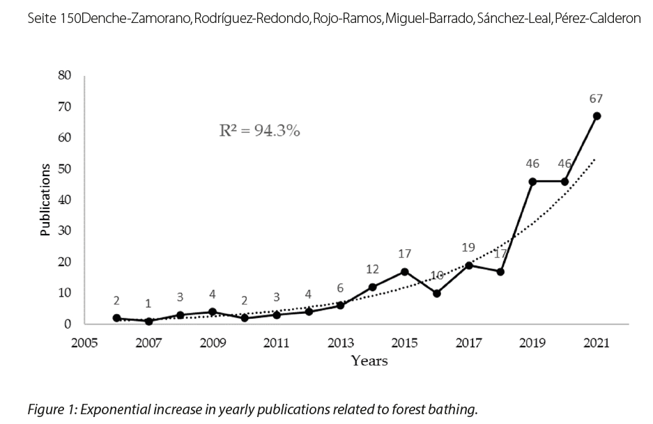 Otra importante revisión de A. Denche-Zamorano et al (2024) con un set de 285 documentos concluye que los baños de bosque despiertan un interés creciente en el ámbito científico, con publicaciones anuales que siguen una tendencia de crecimiento exponencial. Países como Japón, Corea del Sur y China son los principales productores en este campo, con Yoshifumi Miyazaki como coautor destacado, y la Revista Internacional de Investigación Ambiental y Salud Pública, la revista con mayor número de publicaciones.